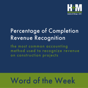 A Percentage of Completion Revenue Recognition is the most common accounting method used to recognize revenue on construction projects. This method requires the reporting of revenues and expenses on a month-by-month basis and is determined by the physical percentage of project completion in each month. Actual revenue and cost for the period are matched against the calculation of the current month percent complete multiplied by the forecasted revenue and cost for the project. The difference between these values is either an asset to the company in the form of work in progress or a liability represented as advanced billings on contracts.
